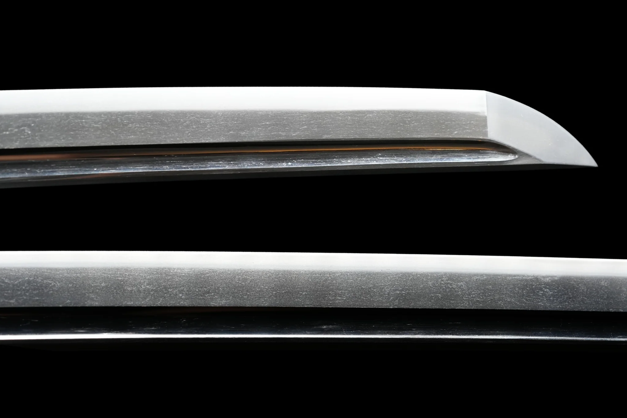 En examinant le jihada, la lame présente un ko-itame mélangé à du masame. La présence de fines ji-nie témoigne de la qualité de la lame, dont l'acier a été forgé avec précision. Des kitae-ware peuvent être aperçus dans le bo-hi, ajoutant une touche de caractère. Le hamon présente un chu-sugu-ha classique avec un ha-buchi lumineux bordé de ko-nie, tandis que le boshi se manifeste comme un ko-maru avec un retour prolongé.
